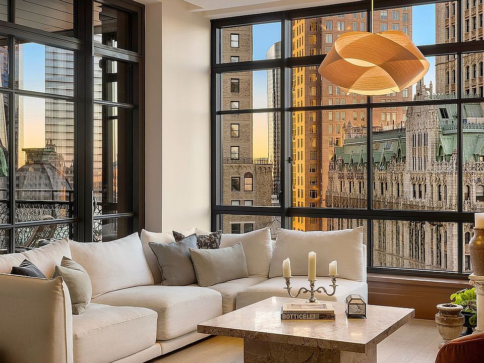 29A, an 1,808 SF three-bedroom, three-bathroom home is arguably one of the best view apartments in the entire condominium. Positioned on the perfect level, the residence offers a direct panoramic sweep of the full city skyline, the lush green expanse of City Hall Park, and a truly one-of-a-kind vantage of the magnificent copper-crested cupola of 15 Hanover Square—an iconic architectural detail that becomes a defining element of the apartment’s atmosphere.
