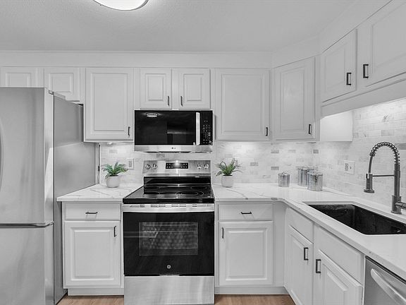 Modern kitchenBreakfast barGranite countertopsPrivate patioStainless steel appliancesVinyl flooringCozy dining nook