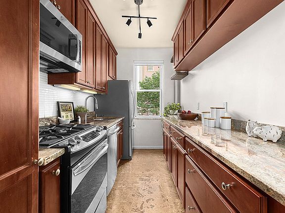 This elegant, palatial one bedroom prime Park Slope coop, boasting nearly 950 sq ft, is calling you home! Perched on the second floor in one of Park Slope's most sought-after full-service elevator buildings sits this expansive and pristine beauty. Through the front door, you will find the grand dining room with a coat closet that leads to the large and lofty living room. Off the formal dining room, the galley kitchen is a chef's dream with ample counter space, a plethora of cabinets, stainless steel appliances, granite countertops, and chic cork flooring. The recently renovated bathroom sparkles with glass shower doors and modern hardware. Finally, make your way to the super spacious and sunny bedroom. The bedroom, facing the back of the building, is pin-drop quiet and so big it can easily accommodate a king-sized bed, an office area, and much more. With charming arched doorways, modern and contemporary lighting throughout, stunning hardwood floors, a sunk-in living room, a big and bright bedroom, and ample closet space (5 large closets in total), this pristine Prime Park Slope show stopper is a must see!