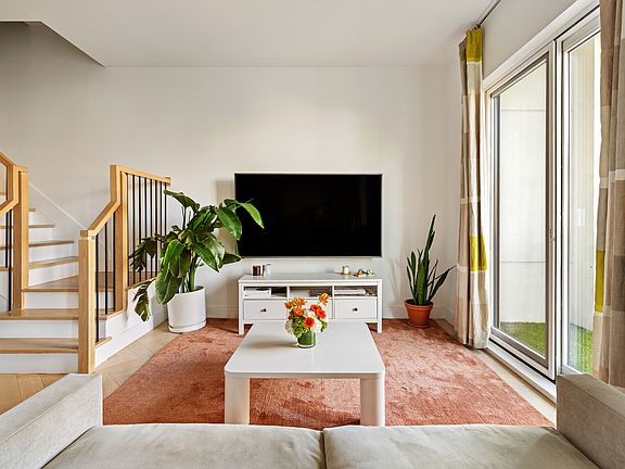 Come home to 3A, a 1,267 SF thoughtfully designed townhouse inspired 2 BR/ 2.5 BA duplex with a massive 700 SF private outdoor roof deck, gorgeous white oak herringbone floors and exceptionally high ceilings with oversized double-paned Pella window. An entry foyer leads you into your living/dining and kitchen. Enjoy cooking in a Scavolini custom kitchen with high-end appliances and entertaining in your two private outdoor spaces. There is a half bath on the main level, under stair storage and a private balcony.