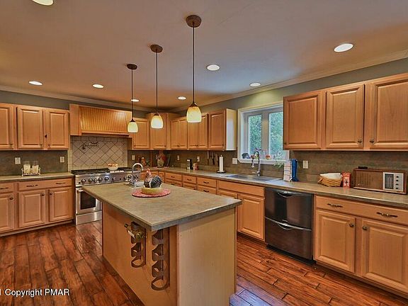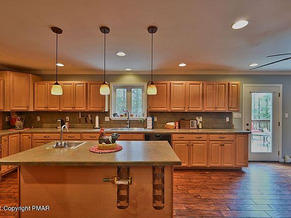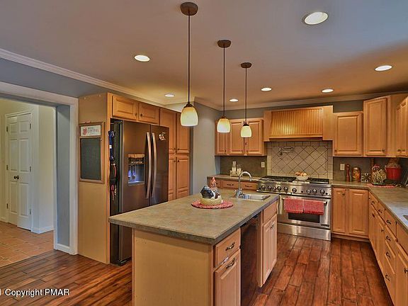 Make this timeless Mt. Pocono home yours - appealingly transformed inside & out. Relax on the picture perfect wrap-around porch or lounge on the large deck overlooking the landscaped fenced yard. Interior renovations & expansion begin with the thoughtfully designed & meticulously executed Chef's kitchen featuring 6-burner gas stove, farmhouse sink, double-drawer dishwasher & expansive island w/ prep sink. Hardwood flooring throughout most of the 1st floor. Tucked upstairs: 3 bedrooms and a large bathroom. Walk out lower level has a generously sized family room w/ kitchen, office & 3/4 bath - easily repurposed into an ideal space for guests or extended family. Walkable location, close to shops & services, easy commuter access to major highway