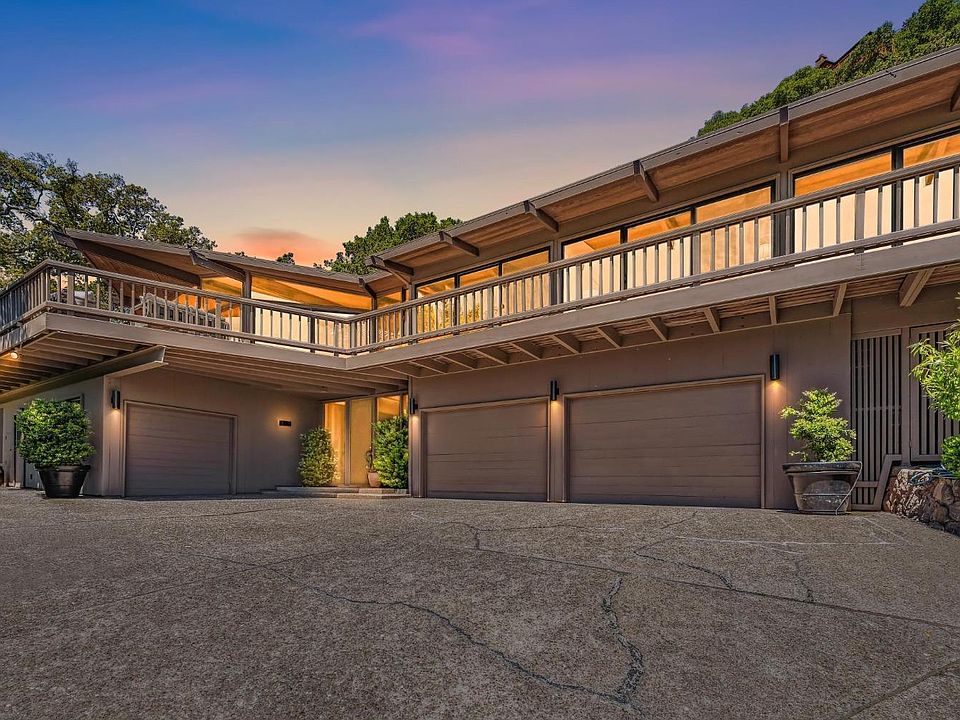 Step into a masterpiece of Mid Century design at 25 Rock Road, where the visionary touch of renowned architect George Rockrise meets the landscapes crafted by Lawrence Halprin. Nestled in Kent Woodlands in Marin County, CA, this architectural gem boasts captivating views of Mount Tamalpais and the East Bay, inviting you to embrace the essence of California living. The main house unfolds with grace, revealing Rockrise's signature elements at every turn. From the striking open stairwell to the warm embrace of redwood paneling, each detail reflects his commitment to both form and function. Walls of windows flood the interiors with natural light, seamlessly blending indoor and outdoor spaces. With 4 bedrooms and 2.5 baths ,the main house offers comfort and style in equal measure. Embrace the allure of the south-facing orientation, where sun-drenched days and breathtaking vistas await. Entertain with ease on the expansive decks or cool off in the sparkling pool, surrounded by beautiful natural landscaping. The 3 car garage provides ample space for vehicles and storage. And for those seeking a space for creativity or guests, an additional ~605 square foot studio beckons, complete with a full bath.Close to the trails of Mount Tam, many fine restaurants and award winning Schools.