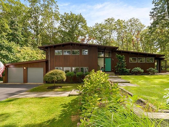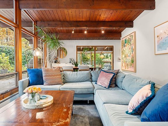 Stunning Mid-Century Modern Deck House set on over an acre in Hingham’s coveted Rockwood neighborhood. This architecturally distinctive home features vaulted wood-beamed ceilings, floor-to-ceiling stone fireplace, and a striking wall of windows overlooking a private deck and lush gardens. The gourmet Faneuil custom kitchen offers high-end appliances, induction cooktop and eat-in dining space opening to a window encompassed 3-season sunroom. The upper level includes a primary suite with an oversized closet and a spa-like bath featuring radiant floors, a soaking tub, and a newly updated walk-in shower. A versatile sitting room and office provide options for a workspace, playroom, or guest room. The lower level offers two add'l bedrooms, a full bath with radiant floors, an oversized laundry room, and access to the two-car garage. Recent updates include a new roof and AC (2021). Ideally located just minutes from Hingham Center, the harbor, downtown, library, and East School.