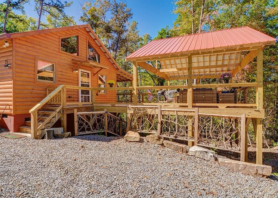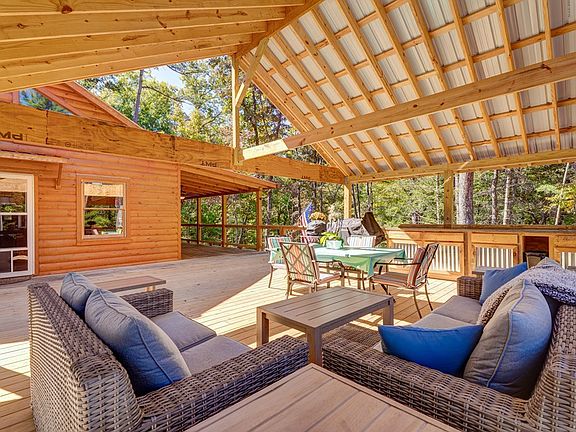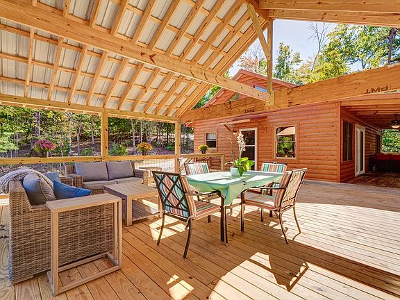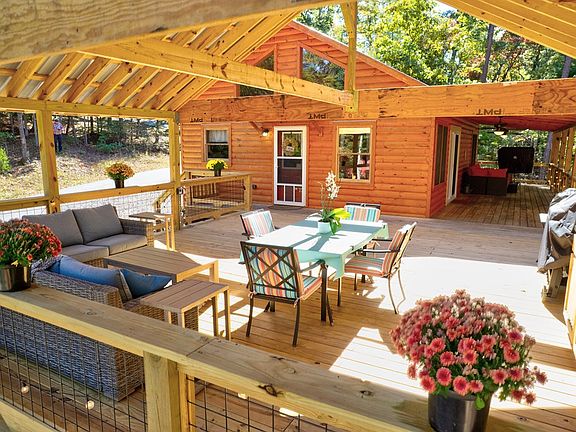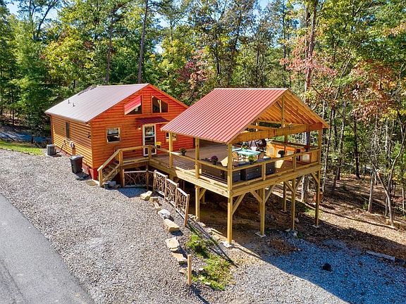 This beautiful furnished cabin built in 2022 offers a private setting with 2 bedrooms and 2 bathrooms in addition to 900sq ft of covered porches for additional space to enjoy the nature and beauty that surrounds you. AMPLE PARKING & ALL PAVED ROADS to this cabin and just a short ride to Downtown Murphy, Casino and nearby Georgia Towns. Perfect for primary, 2nd home or short term rental. The open concept floor plan features volume ceilings, detail woodwork, gas fireplace with stone accents as well as large windows and glass doors for ample natural light. The porches are a dream and include a 10X42 covered porch in addition to the BRAND NEW 25X25 covered porch with 20+ft ceiling and kitchen area with a BRAND NEW 12ft cabinet finished in Rough Mill wood & sealed concrete counter top. This is a dream come true for enjoying outside cookouts & living. The kitchen has stone countertops and stainless steel appliances. The dining area overlooks your porches and is inviting. Glass doors lead from your spacious living room area to your porches. Your main bedroom has several windows for natural light and a en-suite bathroom. Your 2nd bathroom includes a laundry area. This cabin is in a small community of well kept cabins- LOW HOA fee includes road and water. Great opportunity to own this great cabin- come see today.