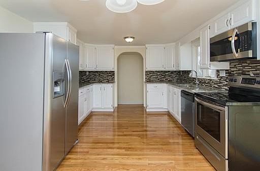 Welcome Home! This beautiful sun filled home in a desirable neighborhood features updated kitchen with NEW Granite Counters, Tile Back Splash, Hardwood Flooring and NEW SS Appliances. Living room has Cathedral Ceiling, Skylight, Hardwood flooring,Wood Burning Stove. Beautiful Master bedroom with Master Bath. Three additional spacious bedrooms all with hardwood flooring. Full bath with Granite and Tile Flooring. Finished basement great for a family room, man town, play room, additional bedrooms you decide!! Freshly painted throughout! NEW ROOF! Most windows are NEW! Enjoy entertaining on the newly built deck and Fenced in Yard. Close to shopping, theaters, restaurants, and entertainment as well as commuter friendly to 495, 95, 90 and commuter rail.