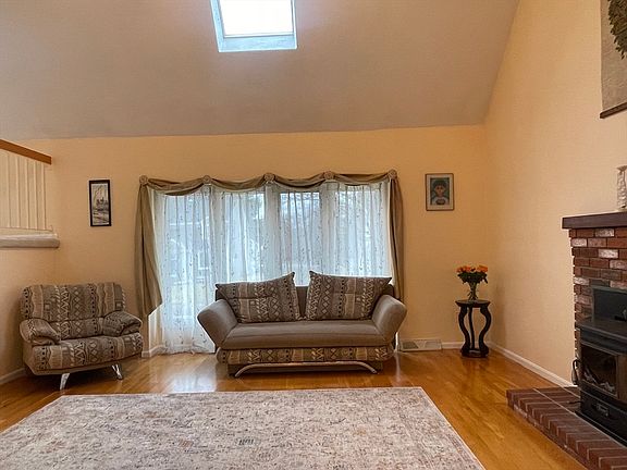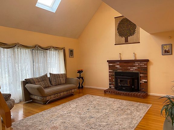 Stunning FRESHLY PAINTED contemporary home nestled in a cul-de-sac. Open floor plan. New a/c compressor, water heater, water softener, new gutters, newly painted inside. Tiled entrance foyer with coat closet. Grand living room with cathedral ceilings, skylights, ceiling fan, picture window, gleaming hardwood floors, and wood burning stove. Dining room with recessed lights, hardwood floors, and new sliding door to private deck. Gorgeous eat-in 10-year old fully equipped contemporary kitchen w/granite countertops, recessed lights, and sconces. Private spacious bedroom with its own full bath. Two more good size bedrooms w/ample closet space and a bathroom. Large loft with an additional room to be finished. Lovely office downstairs that can be used as 4th bedroom. Big family room with electric stove. 3d full bathroom with tiled shower. Washer and dryer. Direct access to a two-car garage. Additional storage under deck. Fabulous location: close to highways, shopping, public transportation!