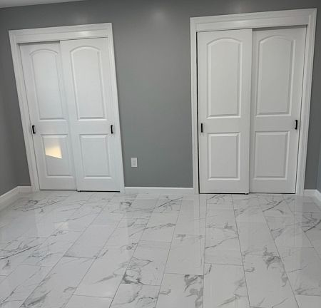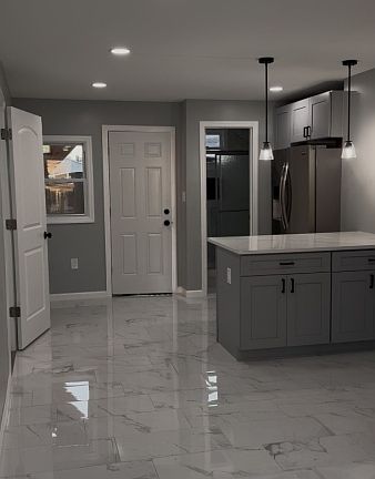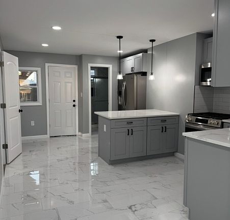 Stylish lightingHigh-end finishesSleek tile bathroomNeutral tonesCustom cabinetryStainless steel appliancesEasy-to-clean flooring