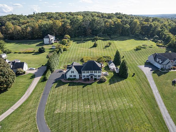 Prominently set on 2.6 acres of manicured grounds, this highly appointed Colonial exudes elegance, while offering a layout designed for everyday living. From the moment you arrive, the setting impresses-lush greenery, striking curb appeal, and an outdoor oasis designed for both relaxation and entertaining. The resort-style outdoor living is nothing short of spectacular..in-ground pool framed by two expansive patios, beautifully crafted cabana with detailed trim, and pergola-topped deck make every day feel like you are vacationing at a luxury resort. Custom designed with no details spared; the home is a showcase of unparalleled craftsmanship featuring multi-tiered crown moldings, shadow-boxing, tray ceilings, transom windows, and gleaming hardwood floors throughout. At the heart of the home, is the chef's kitchen featuring custom cabinetry, intricate millwork, professional-grade appliances, large center island, pantry. The floorplan was designed to naturally and seamlessly blend together between the kitchen, living room, dining room, family room, and extend outdoors to the resort-style pool area. The upper level offers four large bedrooms, highlighted by the luxurious primary suite. French doors lead to a spa-inspired bath with dual sinks, jetted tub, tiled shower, and spectacular walk-in closet with custom built-ins. The spacious great room with built-ins and a full bath, is the perfect game room, office, or guest suite.