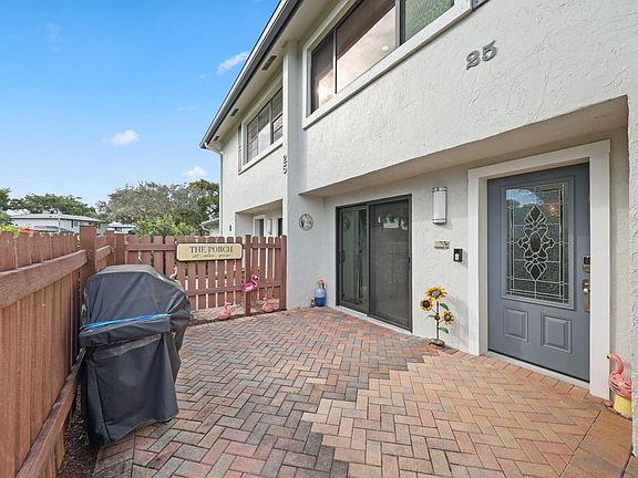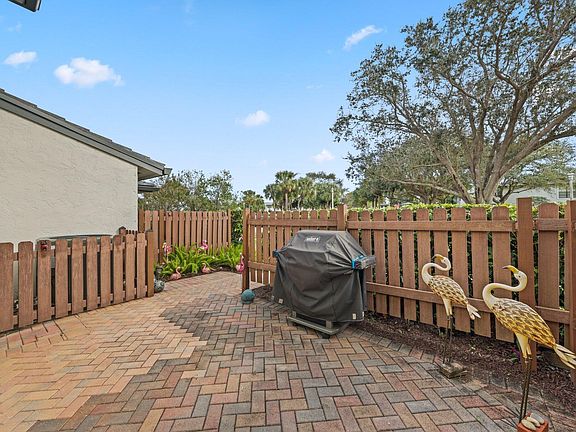Paradise awaits in this meticulously remodeled 2-bedroom, 2.5-bathroom townhome in the prestigious Hunters Run community. With upgrades at every turn, this home features impact glass on all windows and doors, a new roof (2024), AC (2022), tankless water heater, and recessed LED lighting. The chef's kitchen boasts quartz countertops, 2023 refrigerator, stainless steel appliances, and a pantry with pull-out drawers. The updated powder room and separate laundry room with extra storage complete the main level. Upstairs, the expansive primary suite includes remote blackout shades, a custom closet with custom pull-out drawers and a spa-like bath with a walk-in shower and Jacuzzi tub. The guest suite offers an en-suite bath, and both bedrooms enjoy stunning golf course views. Outside, entertain on the spacious patio with room for BBQs AND your own golf cart parking. Southport has an exclusive satellite pool and clubhouse, as well as the main HR Clubhouse.