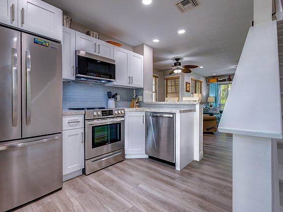 This larger style 2 bedroom/1.5 bathroom home has just been beautifully renovated throughout with a new kitchen, all brand new stainless appliances, new bathrooms, beach style flooring upstairs and downstairs plus shiplap accent walls in the living area and main bedroom. The central AC system was also recently replaced.The home benefits from having a larger living/dining area than the standard Golf Club homes. It also has a walk out balcony off the front bedroom and a large deck off the rear bedroom. Downstairs the kitchen/dining/living areas flow through a wall of glass doors on to a large deck overlooking the yard and serene butterfly garden. The extra large lagoon style pool and well equipped gym are just a couple of minutes walk away.All of the furniture, furnishings and artwork were recently purchased and are negotiable. The HOA fee includes common area maintenance, pool, gym and club house access, security, basic cable and Wi-Fi.