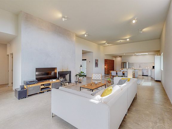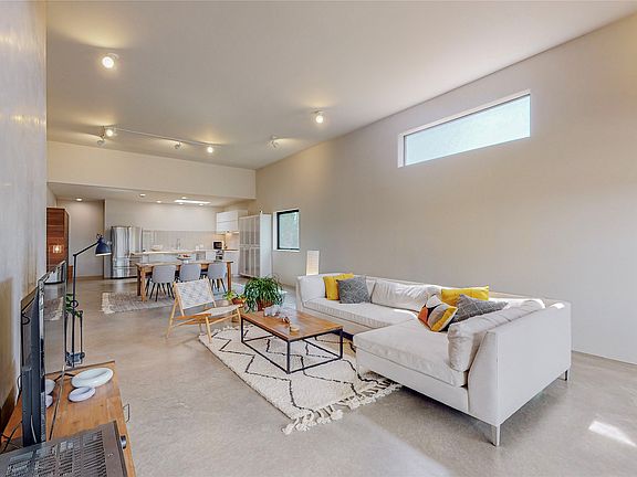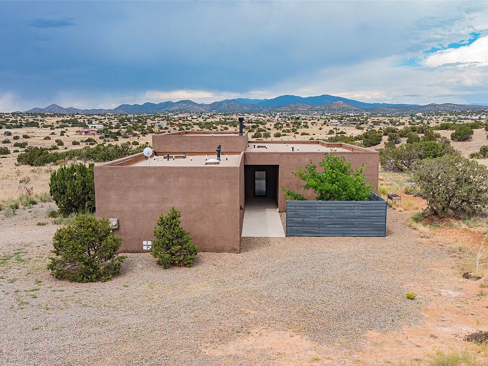 Stunning modern, minimalist designed home by the much sought-after designer/builder, EJ Jennings, with breathtaking views of the Sun and Moon/Sangre de Cristos mountains. The dramatic open concept is ideal for entertaining and living. In the kitchen, you’ll find a generous butcher block center island with seating for guests, sleek Euro-style cabinetry, quartz countertops, and stainless appliances. Jennings’ homes are known for their 2 by 8 construction and 14-inch joists, allowing for more insulation. This home also offers smooth finish concrete floors, a high-efficiency heating system, R50 roof and R30 walls, Cat 6 wiring, and insulation in interior walls for soundproofing. You’ll also find high-end commercial-quality windows. There is a split bedroom plan with a beamed ceiling in the main suite, a beautifully tiled and spacious master bath, a generously sized second bedroom, and an oversized 3rd bedroom, which is designed to be a studio/ work area with exterior access. There are walking trails to the nearby Galisteo Preserve for hiking and mountain biking. The convenient Eldorado Community offers shopping and restaurants. No HOA, reasonable restrictive covenants, natural gas, and Eldorado community water. Very short travel on the dirt road to Hwy 285.