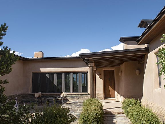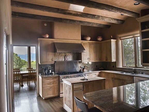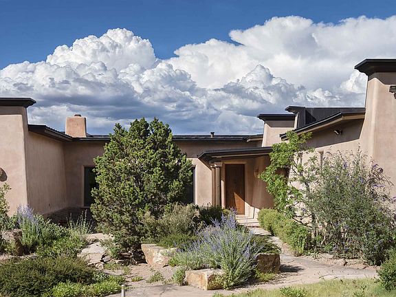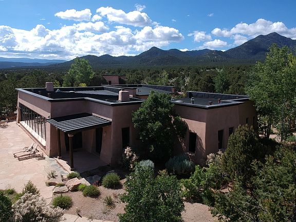 Beauty, Balance and Nature. Escape to this private compound on 26 acres with expansive views of the Taos Valley. The 2 bedroom grand main house, two guest homes (two bedrooms/one bathroom each) and gardens are a balance of contemporary modern and ancient Pueblo architecture. Santa Fe architect John Barton and contractor Ken Wolosin designed the site with contemporary adobe construction including gently tapered walls atop stacked flagstone foundations. While the views are grand, the houses live in balance with the surrounding high desert setting. Thoughtful gardens complete the setting with special attention to the natural surroundings. The main house features an entry gallery, expansive living area with a west wall of custom windows featuring sweeping views from the Rio Grande Gorge to Taos Mountain to Georgia O'Keefe's Cerro Pedernal in Abiquiu all the way to Mt. Blanca in Colorado. Luxurious master suite, gourmet kitchen, dining room, two kiva fireplaces, handmade tiles in bathrooms and guest suite. Spacious floorplan, slate floors, rustic vigas and alluring lighting add to the appeal. Elegant indoor entertaining areas transition with ease to the outdoor living spaces, meandering paths and plenty of private acres to explore. Embrace the balance of beauty and nature at this one-of-a-kind, elegant compound.