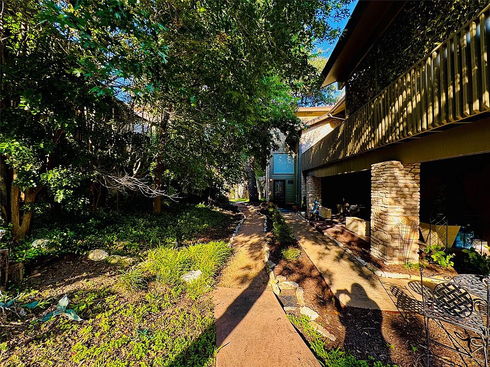 Architectural condominium with a tree-house style feel in a quiet Lakeway community. Large windows and high ceilings create an open, light-filled interior. Features include a custom red oak and wrought iron staircase with a reading nook, a breakfast bar overlooking the garden courtyard, and soft-close cabinetry with added storage. The upstairs deck overlooks the courtyard and shades a small downstairs patio, complete with a propane fire pit and grill. Furnishings are included, along with water and electric. The community offers a pool, trails running alongside the property, and a pond across the street. Residents also enjoy proximity to Lake Travis, multiple golf courses available with a Hills Country Club membership, parks, dining, and shopping. Downtown Austin is just 30 minutes away.