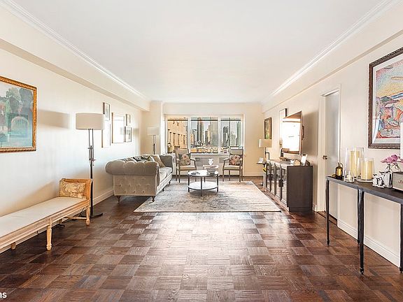 The expansive primary suite is provides a private retreat with an ensuite bathroom and custom California Closets for effortless organization. The split-wing bedroom layout provides both bedrooms utmost quiet and privacy. The apartment has elegant parquet floors & crown moldings, and thru-wall A/C units for year-round comfort.
