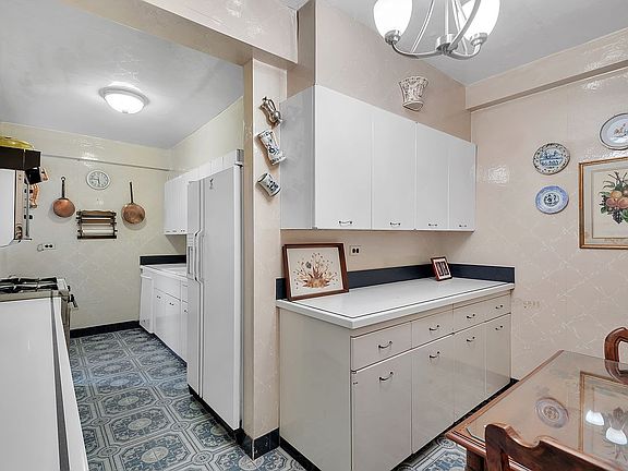 Just imagine this space with the dated decor elements stripped away and you will see a huge modern home with a fantastic layout, without even changing any walls. The huge living room is over 30 feet in length with direct river views, and when opened to the dining room with city views, you have a 50 foot expanse for living and entertaining. The oversized primary suite enjoys direct river views, a white tiled en suite bath and a walk-in closet. The large guest bedroom can easily accommodate a king sized bed, has double closets and open city views. A midcentury modern purist would probably keep the original circa 1960 white enameled steel cabinets but if you are not a fan of retro, the huge footprint of the EIK can accommodate the kitchen of your dreams.