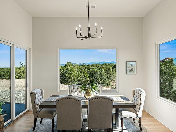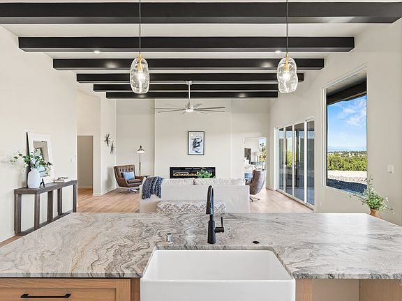 Just completed and ready for occupancy! Mountain views from every window in this new custom built contemporary pueblo style home with open floor plan situated on a huge 10.0 +/- ac. private lot in Lamy. Convenient access to US-285, the Agora shopping center, bank and restaurants. Perfect for indoor and outdoor entertaining. Open kitchen/family/dining room has floor to ceiling windows and double sliding glass doors to take in the fabulous views and access to the portal. The contemporary kitchen has a huge island bar and large walk in pantry. Every room has large picture windows with fabulous mountain views. Owner's bath has double sinks, soaking tub and large walk in shower room with double shower heads and rain showers and a large walk in closet. Home features contemporary style vigas in living areas. Three bedrooms with good separation and 2 baths. A guest house and equestrian structures are allowed, as well as 10 horses or cattle. (1 large animal per acre.) No HOA, recreational vehicles are allowed if parked inconspicuously. Connected to the Eldorado community water system. Located only 20 minutes from Downtown Santa Fe this home offers gorgeous views, rural living and easy access to everything Santa Fe has to offer. This home has it all; new home, fabulous views, great outdoor spaces, contemporary open floor plan, large private lot. Buyer to verify all information and Covenants. Seller gives $4000 credit to the buyer at closing for Range, dishwasher and microwave. Open House Sunday, October 5. 1:00 - 4:00 PM.