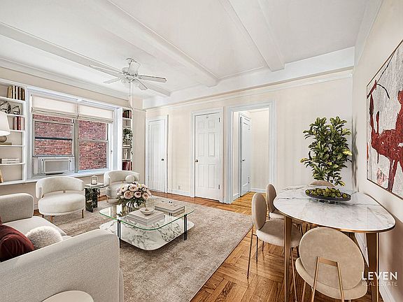 Nestled on a tree-lined street, less than a block from both Central Park and Lincoln Center— one-bedroom in a beautifully maintained, prewar elevator co-op, offering charming architectural details including beamed ceilings, built-ins, and diagonal herringbone hardwood floors. The spacious living room provides a warm and inviting atmosphere, with space for a dining table, and is accented with built-in shelves and beamed ceilings. The adjacent windowed kitchen features a gas range and offers ample cabinet space. The bedroom is separated from the living room by classic French doors and the bath is outfitted thoughtful tile accents, a glass-enclosed tub with a rain shower, and both vanity and medicine cabinet storage. There are also two large closets within the apartment, offering generous space for your storage needs. Additionally, there is a convenient laundry room within the building and cable/internet is provided by the building and included in maintenance figure. Sorry, no pets are allowed.