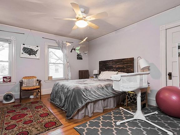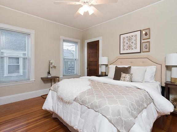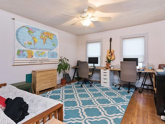 A rare find is this lovingly maintained Davis Sq/Tufts area Philly style 2 floor apartment with living room, dinning room, office, and two enclosed porches and two full baths. Rooms include a sun room/den with window seat & access to a fully screen encl'd covered front porch. Spacious living room & dinning room plus large eat-in kitchen with gas stove, refrigerator, double sink, & disposal. 4 generously proportioned bedrooms (many with several closets or under eave storage) & a large 2nd level bath with a modern neutral tile & bidet. Other perks incl an outside fenced in patio and 2 off street parking spaces. Laundry in basement. Available for move in on 9/1.