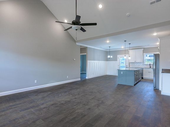 Enter through the front door of 25 Winning Gait Trail to an open living (Cathedral Ceiling), dinging (wall treatment, room for large table, access to back porch), and kitchen (granite counters, large island, built-in coffee bar, window over the sink). great for entertaining. On the left side of the home, you'll enjoy two bedrooms and a full bath and to the right of the kitchen is the mud entry from the two-car garage with built in hall tree, full laundry room with utility sink and cabinets, and the full primary suite with trey ceiling, large closet, and double sinks in the bathroom.