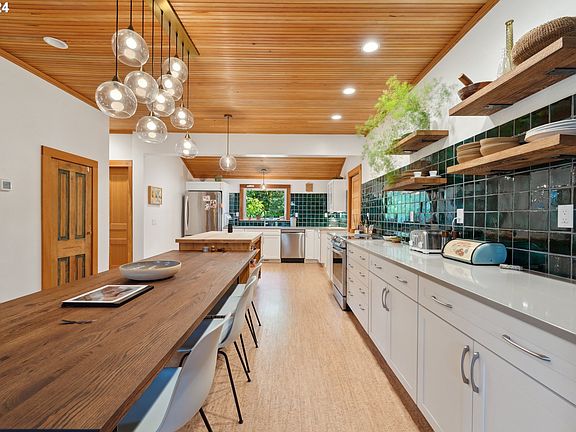 This spacious 1850 square foot home with 4 bedrooms, 2 baths was fully updated in 2021 with custom cabinets and tile work throughout, high fir ceilings, cork flooring downstairs and hardwood upstairs, custom fir doors and trim, new thermal windows, sunny southern exposure, new ducted heating system and quality stainless steel appliances.