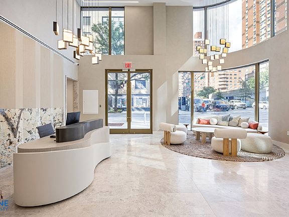 Enter Residence 5E, a spacious and airy two-bedroom sanctuary filled with natural light pouring through floor-to-ceiling oversized windows. The open kitchen is a culinary masterpiece, featuring pristine marble countertops, a striking backsplash, and sleek white lacquer cabinets. Integrated high-end appliances, including a Thermador refrigerator and Bosch dishwasher, ensure a seamless cooking experience. Every residence is thoughtfully equipped with central air conditioning, an in-unit washer and dryer, and a smart entry lock for your convenience.