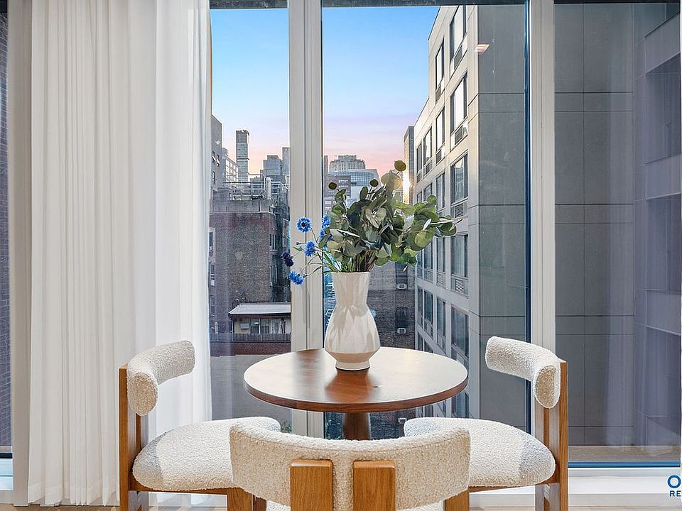 Enter Residence 9A, a spacious and airy two-bedroom sanctuary filled with natural light pouring through floor-to-ceiling oversized windows. The open kitchen is a culinary masterpiece, featuring pristine marble countertops, a striking backsplash, and an island complemented by sleek white lacquer cabinets. Integrated high-end appliances, including a Thermador refrigerator and Bosch dishwasher, ensure a seamless cooking experience. Every residence is thoughtfully equipped with central air conditioning, an in-unit washer and dryer, and a smart entry lock for your convenience.