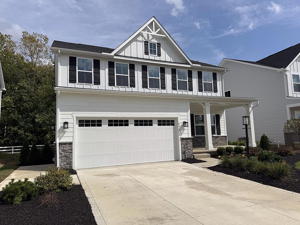 Beautifully designed 3 bed 3.5 bath former model home with no expense spared in Olentangy Schools. Loft upstairs could be 4th bedroom and finished basement with egress window offers additional living or entertaining options. On the main level you will find an office with glass french doors, great room with gas-log fireplace, mud room with extra storage and half bath access, eating space, and fully loaded kitchen equipped with stainless steel appliances (gas cook), granite countertops, large island with breakfast ledge and pendant lights, and upgraded white cabinets. Off the back of the house is a large covered deck which backs up the wooded area. Puck LED lights dot the ceiling offering great lighting and energy efficiency while luxury vinyl plank (LVP) flooring runs through the entire first floor! Solid wood stairs lead you up to the loft, bedrooms and 2nd floor laundry room. The master bedroom is extremely spacious; the closet could be mistaken for a nursery! the private bathroom includes tiled floors, dual raised vanity, and a tiled walk-in roman shower with two shower heads + long bench. Back down to the finished basement with egress window you will find the 3rd full bathroom, plenty of finished living space, and plenty of storage in the unfinished area. Lighting and plumbing packages were upgraded and the whole house has been styled and painted by design professionals. Being a former model, the garage was a sales office and has been converted back but you get to keep the fully insulated and finished walls, additional lighting and tons of outlets + a convenient service door. Professionally installed irrigation system keeps landscaping beautiful. This truly is an amazing opportunity to join the Olentangy School District and be the first owner to occupy this new home!