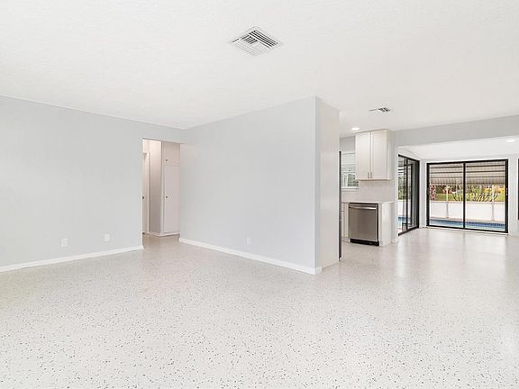 Amazing deal on a waterfront pool home available for lease in SoSo! This 2 bedroom, 2 bath home is light and bright with an open living area and gleaming terrazzo floors throughout for easy maintenance. The clean design kitchen is updated with white cabinetry, quartz countertops and brand new Samsung stainless steel appliances including a dishwasher, an electric range, a built in microwave oven and a French Door refrigerator with ice maker. The primary suite has a wall of closets and an ensuite master with glass enclosed shower and new vanity. The second bedroom is by the hall bath that is updated with a combination tub/shower and new vanity. The Florida Room has a bank of windows overlooking the pool and backyard and sliders to the screened patio - perfect for entertaining. The home has a 1 car garage with full-sized front loading washer and dryer.