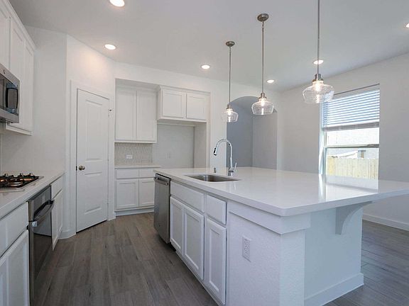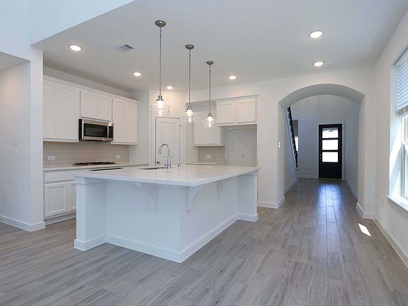 This plan feels open yet cozy. Dramatic two-story entry features an additional bedroom and full bath downstairs, a kitchen with an oversized island opens up to the bright dining area with a window seat and family room with a vaulted ceiling and doors to the outdoor living area. The master suite is downstairs and two bedrooms and a game room open to below are upstairs.