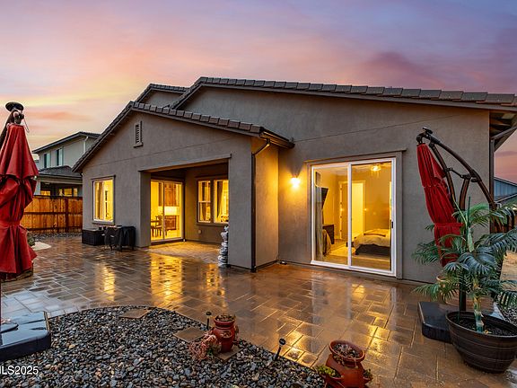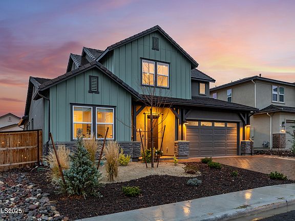 Beautiful and elevated Plan 4 home in Verdi, with a clean modern aesthetic and mountain views. The layout includes two main-level bedrooms including the primary, creating flexibility for guests, office space, or multigenerational living. Interior upgrades include a waterfall island in the kitchen, custom backsplash, coffee bar nook, complemented by ceiling-height cabinetry and luxury wide plank flooring throughout the main spaces. The living room features a floor-to-ceiling tiled fireplace with a mantel and vaulted ceilings. Ease of maintenance in the back outdoor space is accented by a full paver patio with xeriscaping. Propane stub available for a future outdoor kitchen if desired. A tankless water heater for efficiency and eve outlets for holiday lights and heat tape provide added convenience. The home has been exceptionally maintained, feels brand new, and allows loads of natural light with the elevated and expansive windows. Grab your dirt bikes, side by sides, snow shoes, or simply hike out of the neighborhood for incredible outdoor lifestyle adventure access. A quick twenty minute drive to ski slopes, or fifteen minute drive to downtown/midtown activities. What true Verdi living is all about!