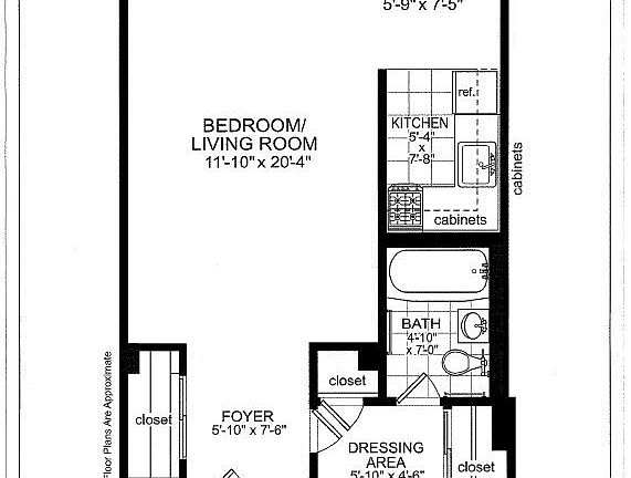 Bright alcove studio with dining area and full size kitchen. Dressing area plus 3 closets. Bright East facing windows. Through the wall A/C unit included.