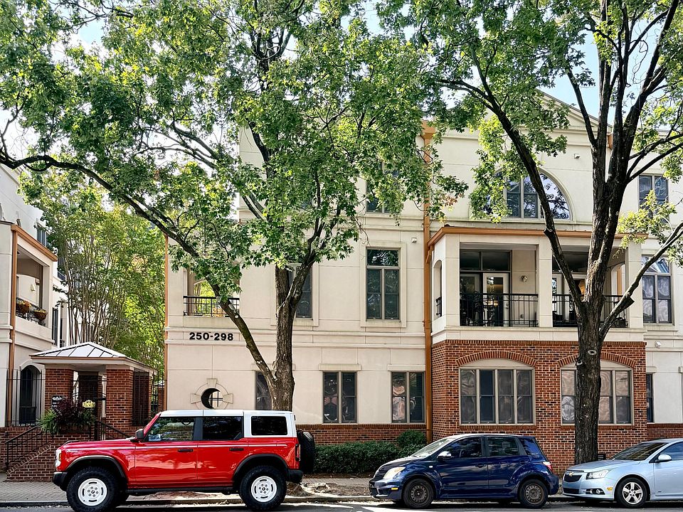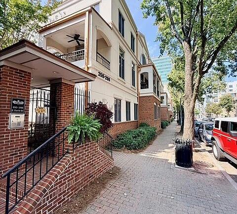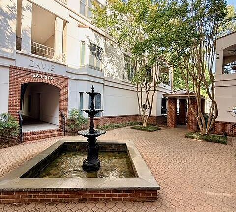 Downtown living meets designer charm in this ground-level end-unit condo, where classic updates meet bold personality. Hardwood floors, 9' ceilings, and a wood-burning fireplace create a warm backdrop, while playful accent walls and custom details make the home truly one-of-a-kind. The open family room flows effortlessly into the dining area while the kitchen shines with custom cabinetry, stainless appliances, and a clear sightline for easy entertaining. Two spacious bedrooms feature vibrant finishes with cleverly concealed closets, blending character with thoughtful functionality. Throughout the home, intentional design has maximized storage, ensuring every inch is as practical as it is stylish. Step outside to your private covered patio, enjoy the convenience of gated parking, and embrace a lifestyle just steps from Moore Square, City Market, Artspace, and Raleigh's best dining and nightlife. New HVAC (9/2025) & Heat Pump (1/2025)! One free parking spot included (additional spot available for only $50/year).