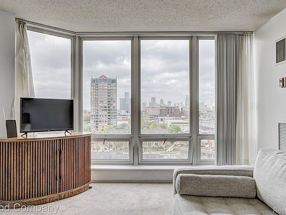 This stunning High rise condo in a gated community offers breathtaking views of both the Detroit Riverfront and the downtown skyline from a bright, light-filled living room with floor-to-ceiling windows. The spacious layout includes a roomy kitchen with convenient bar seating open to the main living space. Just off the kitchen, you'll find a dedicated storage and laundry room for added functionality. The large bedroom features wall-to-wall windows, a generous walk-in closet, and easy access to a clean, modern full bath. Enjoy all the perks of peaceful, luxury condo living with top-notch amenities including a fully equipped fitness center, two sparkling pools with locker rooms and shower facilities, a game room equipped with a full kitchen which is also available for private rental, from parties to weddings. Enjoy direct access to the beautiful River walk waterfront from Belle Isle to Heart Plaza and marina. Options for a boat slip, so bring your boat! 1 pet welcome, covered parking with 1 assigned space, Huntington Cleaners services and handicapped parking also available on site. Potential to purchase furnished with an acceptable offer. Welcome Home!
