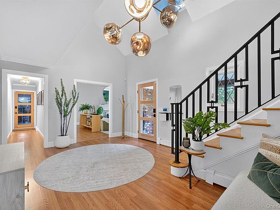 The unmatched privacy and acreage is within an ideal distance from everything that the Hudson Valley has to offer as a full-time or weekend home, ready for you to entertain and host. You are welcomed with a charming front porch at the entryway, sun-filled open spaces, and a comfortable flow ideal for both lively entertaining and everyday family living. Walk into the large and bright foyer with an original Tom Dixon chandelier. On the main level there is a comfortable and relaxing living room, a private flex area currently used as an office, a powder room, private primary bedroom with en-suite bath and walk in closet, a formal dining room, an eat in kitchen with high end stainless steel appliances including a Bertazzoni Italian range oven which gives access and views to the all-season sunroom overlooking the grounds. Upstairs, an open landing leads to another primary bedroom option with en-suite bathroom and 2 more bedrooms with a full hallway bathroom. There is a finished basement providing extensive storage options, a laundry area with washer and dryer units (x2), a family entertainment space perfect for movie and game nights, with additional space that can be used as a home gym.