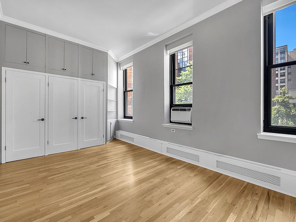 The primary suite, over 18 feet in length, affords a sense of scale rarely found in the Village, easily accommodating a king bed, lounge, and dedicated study. The open living and dining area is equally versatile—anchored by a charming alcove perfect for intimate dinners, with custom shelving that adds both character and utility.