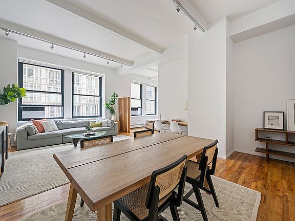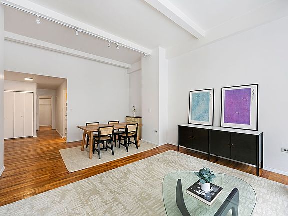 The layout flows with well-zoned living, dining, and work areas that invite creativity in layout. A sublime feature of the apartment is its enormous walk-in closet, thoughtfully designed with three tiers of hanging space, accommodating everything in a plentiful yet discerning wardrobe. There is also additional ceiling height that can be recaptured over the foyer, kitchen, secondary closets, and bathroom which can be used for storage or creating an even loftier vibe.
