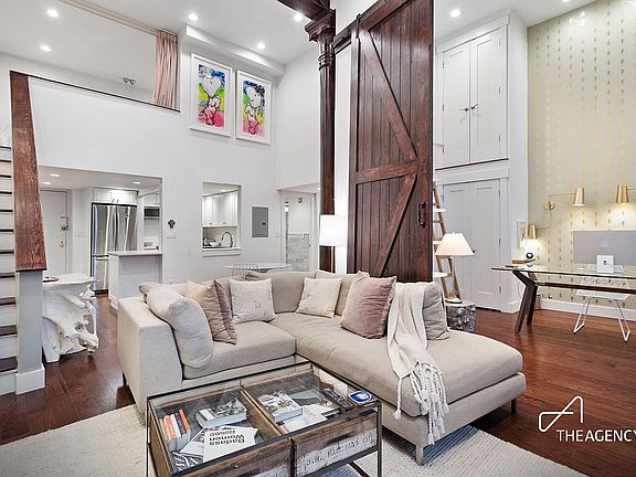 Following through to the living room, you will find yourself feeling a little smaller in the cavernous 17 foot high ceilings, Extra-large windows with matching white quartz sills, crystal chandelier above with separate dimmable recessed lighting, and custom 12 foot sliding barn doors!