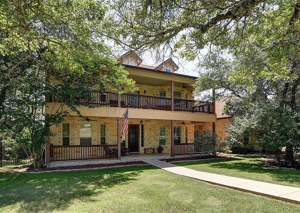 Cul-de-sac, rare sized lot, almost 3 acres! Roam the trails, enjoy the wilderness & wildlife in backyard, play in side & front yard w/wrought iron fencing, sit on a spacious wrap around deck or front covered patios. Island kitchen, granite counters, double ovens, custom cabinetry. New wood floors downstairs, shutters all front windows, Master down w/ outside access. 2 staircase - front & back. Study upgraded with barn doors, living room has been upgraded with shiplap walls. Loft & game room for kids/teens. Enjoy private Guadalupe River Access and if you love golf, you have optional membership at the club. Come enjoy beautiful sunsets, deer, bird watching and privacy in this serene setting in River Crossing, Texas Hill Country!