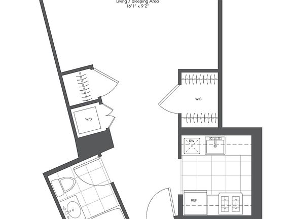 This alcove studio apartment features a spacious living area with high ceilings, walk-in closet, separate closed kitchen, in-home washer/dryer, and northeast exposure.