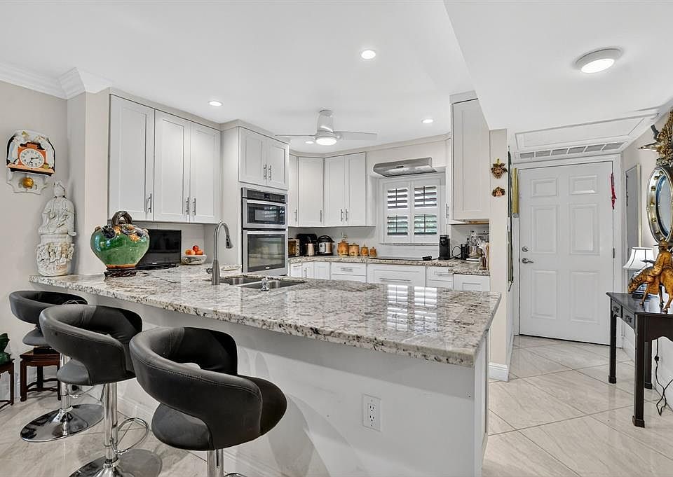 Fully remodeled 2nd floor corner unit near Dixie and Federal Highway on 20th. Great location with shopping, dining, entertainment, and beach options all within 5 minutes. Kitchen has been opened, connecting it to the dining and living areas. No popcorn ceilings! Crown moulding throughout, beautiful tile floors, white cabinets, stainless steel appliances, impact windows and roller shades for hurricane protection, tankless water heater, and in-unit washer/dryer. The primary bedroom has an ensuite bathroom with shower and access to the screened porch overlooking the greenspace leading to the pool. The 2nd br is spacious and has a full wall of closets. Parking space right at the bottom of the stairs. Super East Boca Raton location and great location within the community too!