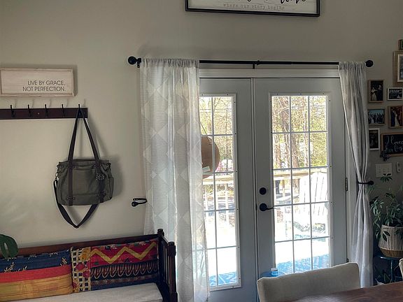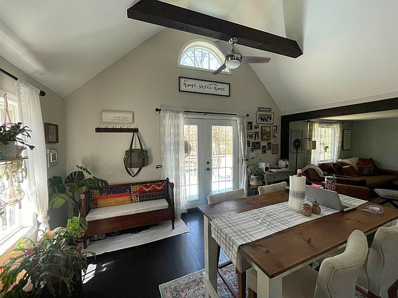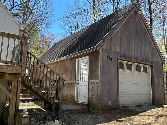 250 Oak Hill Rd, Northfield. Are you searching for a peaceful sanctuary in the woods? This lovely raised ranch will fit the bill! Situated on an almost half acre lot not far from town, this home offers a beautiful open-concept living space and oversized 1 car garage with storage that is sure to please. Entry through the front french doors into the cathedral-ceiling dining/kitchen- complete with gorgeous dark plank flooring, newer kitchen cabinets, newer appliances, island with a butcher block top and plenty of natural light to complement the space. Matching beams in the cathedral ceiling and transom window nicely accentuate the space. Through the living room and into the updated bath featuring gorgeous tile flooring, newer vanity, toilet and pretty accent wall. The oversized bedroom (converted from two bedrooms into one large primary) features french doors onto a small side deck and plenty of natural light with a front to back layout. The back yard feels like a retreat with an outbuilding (previously used as a bar) and pergola seating area, as well as plenty of wide-open space to roam or host summer gatherings. The detached one oversized stall garage offers plenty of storage room with a lofted area, as well as more than ample space for a hobbyist or workshop. Updates to include new tankless hot water system with propane, as well as insulation in the crawlspace/basement area. A beautiful home ready for a new owner- could it be you?