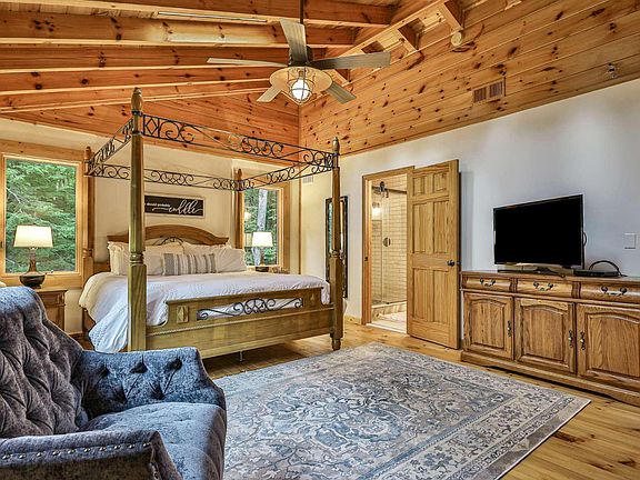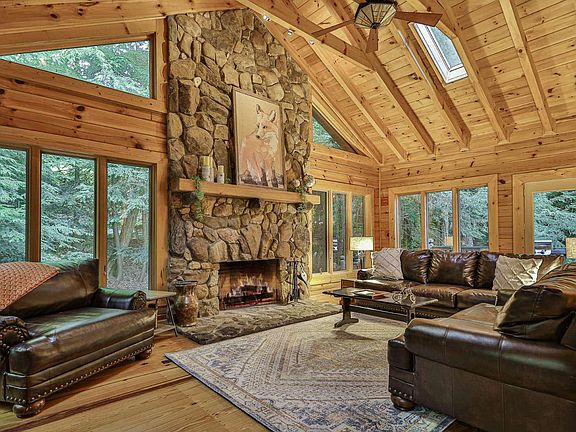 Welcome to Hidden Hemlocks Lodge. 12.2 Acre PRIVATE Estate with a picturesque setting, selling mostly FURNISHED! Located in private gated reserve off Turniptown Road, (one of the most sought after areas in the County), just a few min. from 20,000 acres of National Forest & less than 10 mi. from town, A RARE FIND! Home features 4BR/3BA plus a bunk room; soaring cathedral ceilings, huge living room, wood burning stone fireplace, well appointed chef's kitchen, keeping area w/wood stove, newly renovated master bath, (all new sinks, toilets, interior paint), generator, tankless hot water htr, 2 car garage. You'll love the outdoor living! Relax on the huge covered porch & hearing the sounds of the waterfalls from the creek, also a small pond, outdoor fire pit, & hiking trails. If you like to garden, there's a fenced raised bed garden area, 2 small storage barns & greenhouse. No HOA Fees.