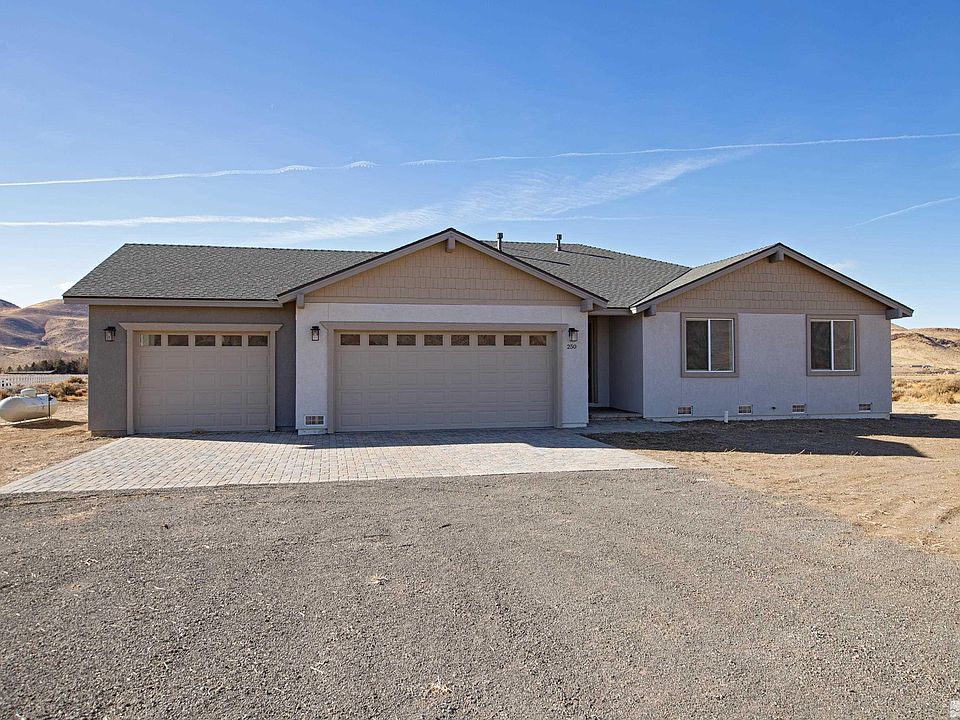 Get the charming rural experience complemented with the ease and conveniences of urban living just down the road, giving you the best of both worlds. Step back to when we all had room to breathe. The American dream of living on acreage with no HOA means that your plot is yours to play with and play on, be it with large-toy storage, self-sustained gardening, play areas, and more., Bask in the sunshine of a Nevada day while the dogs run and the kids play, out of sight but within the safety and solitude of your acreage. Wander your property with your morning coffee, stretching your legs and surveying your swathe. Stunning two-tone stucco and upgraded garage doors start the elegance. It continues inside with eye-pleasing contemporary features such as striking eight-foot raised panel doors throughout, five-inch baseboards, and high-end flooring. Breathe in and appreciate the breadth of the high ceilings and mountain views in the great room. Snuggle up and cozy in with a family movie night or time in front of a warm fire. The modern style of light-colored, square-edged granite countertops balances the timeless wooden cabinets. The breakfast bar island, walk-in pantry, upgraded cabinets, and breakfast nook give all the space and storage needed to entertain a group or maintain daily life. A barn door divides the owner's suite and spa-like bath, where attention to detail continues. Separated double sinks offer more of the expanse this home embodies. At the same time, the soaking tub beckons you to slow down and relax. When the day calls for action, the walk-in shower and walk-in closet move you along with ease. Includes a deep well (supported by whole-home water filtration) and septic, as well as shared road maintenance by property owners. Furniture staging and photos represent a model home and may be subject to change.