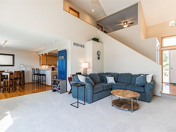That view! Open main floor plan with cathedral ceilings, gas fireplace, hardwood floors, NEW carpet on the main floor, 1/2 bath off the kitchen, sliding door to the deck and that amazing view of the pond. Upper floor features a loft area perfect for a library, office or play room, primary bedroom w/ en-suite, 2nd bedroom and 2nd full bath. Walkout LL family room has LVP and access to the fenced yard that backs up to the walking trail. 1 year HSA Home Warranty with accepted offer. Garage shelving is reserved.