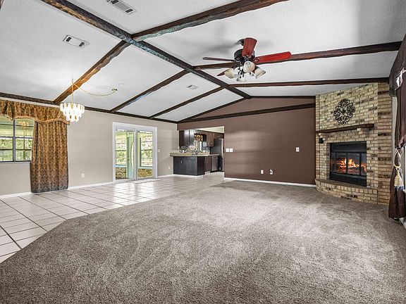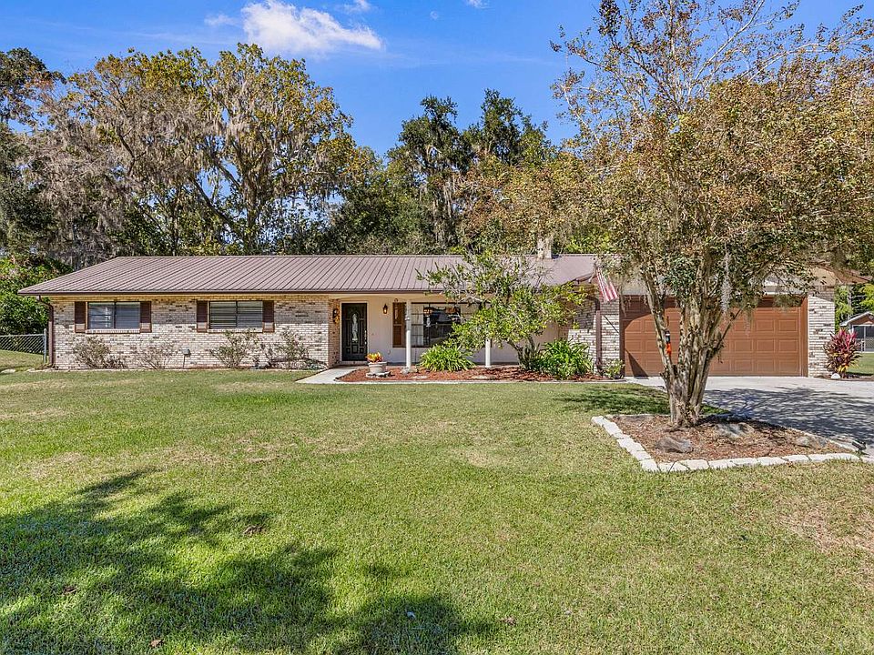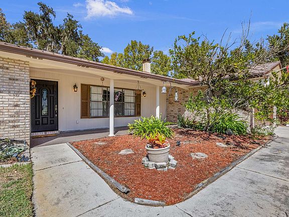 Nestled along a picturesque white sandy bottom creek, this well-maintained home offers a serene and inviting retreat. The property’s highlight is the screened dock house with a balcony overlook—perfect for relaxing, entertaining, or simply enjoying the peaceful views as the creek gently winds through the back of the property. Inside, the home features a large great room with a cozy fireplace and charming wood-beamed ceiling, creating a warm and welcoming ambiance. The kitchen is both stylish and functional with hard surface countertops and a trendy backsplash. A spacious Florida Room across the back of the home features large windows that overlook the fenced backyard, bringing in plenty of natural light and scenic views. The generous utility room, located just off the two-car garage, offers added convenience and storage space. A detached workshop/garage provides the perfect space for hobbies, equipment, or extra parking. The property also features mature orange, grapefruit, and fig trees, adding to its charm. This exceptional property combines comfortable living and tranquility.