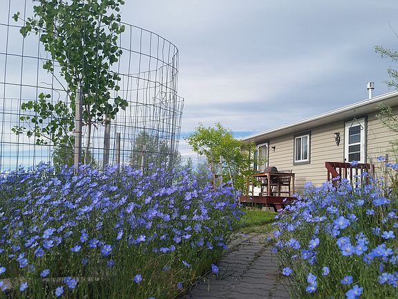 Bring your horses and enjoy the wildlife! Beautiful views of surrounding mountain ranges! Energy efficient, 4 bedroom single level rancher with custom log guest cabin and garage + barn on 5 acres. Fenced and cross fenced into 4 pastures plus riding arena with no covenants! Open floor plan with vaulted ceilings. New roof and heating system installed in 2018. Windows strategically placed to maximize the unobstructed mountain views. Mature trees surround each of the 3 buildings. Inviting green custom built log guest house for when guests visit with 1 bedroom + loft. Detached heated garage with large bays that include additional shop, tack room and barn. Just 1.5 miles from town.