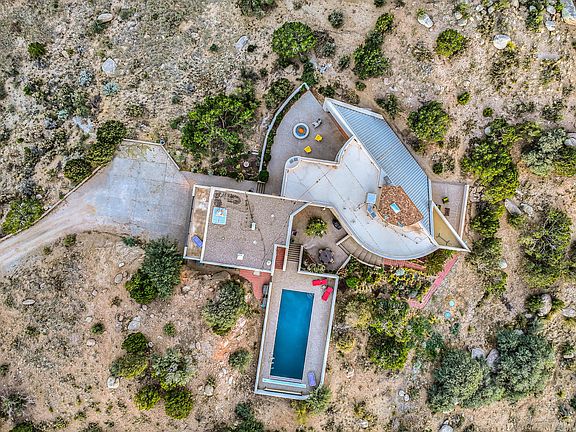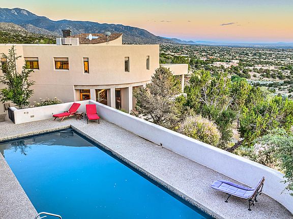 This gorgeous Anthony Predock home, known as ''The Boulder House,'' sits on an elevated, extremely private lot with spectacular, unprecedented views of the city lights, sunsets, & mountains. This modern, contemporary beauty features clean lines & is surrounded by the beauty of the high desert. Stunningly oriented to maximize the astounding, uncompromised views of the Sandia mountains & westward city views of Mount Taylor & dormant volcanos in the distance. A real gem amidst the sky, wind and rocks. The chef's kitchen features top of the line appliances and a built-in wine fridge. Enjoy the private pool amongst the boulders & views. The primary suite has 2 walk-in closets & an amazing bathroom. Floors are brick, wood, and tile. Truly one of a kind. Come at sunset for jaw-dropping views.