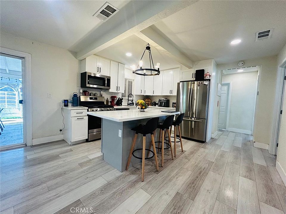 Single-story home 3 Bedrooms, 1 Bathroom, completely remodeled! Covered patio & LARGE backyard! Step into an open-concept kitchen featuring recessed lighting and new wood laminate flooring throughout... Modern kitchen w/brand-new cabinets, granite countertops, an island, and newer appliances, including a stove-oven range, microwave, and dishwasher. Bathroom has been remodeled with a walk-in tile shower; Spacious and individual laundry room! Newer central A/C, heater, windows, including a newer water heater. LARGE LOT WITH PLENTY OF SPACE IN THE BACKYARD TO BUILD A POOL, AN ADU OR TWO! Easy access to Freeways 91/215/60 interchange. Turnkey home ready for the next family!