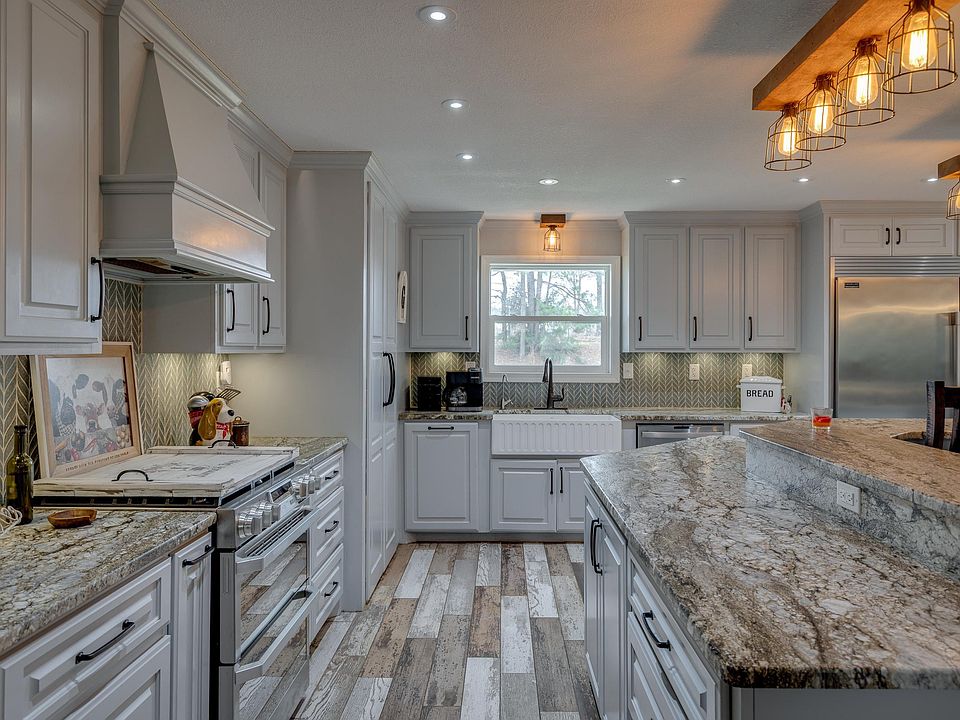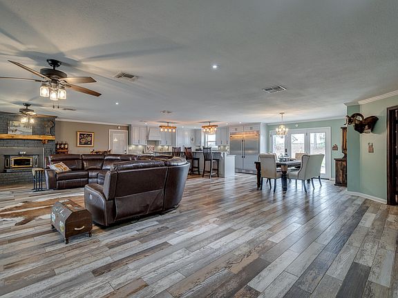 Welcome to your dream home nestled atop a picturesque hill, surrounded by majestic pine trees, offering unparalleled privacy and tranquility on 2.67 acres of fully fenced and gated land. This exceptional 5-bedroom, 4-bathroom residence boasts luxurious features both inside and out, including a spacious 40 x 60 pole barn with electricity on a concrete slab. Step inside to discover a meticulously updated interior where no detail has been overlooked. The heart of the home is a chef's paradise with a fully equipped kitchen showcasing granite countertops, a commercial-sized refrigerator, gas range and oven, built-in microwave, and a walk-in butler's pantry. The expansive kitchen island is perfect for casual dining and entertaining, seamlessly flowing into the open living and dining areas. Work from home effortlessly in the office complete with built-in bookcases, concealing a secret private safe room. Each bedroom is a retreat of its own, with individual bathrooms ensuring comfort and convenience for all occupants. The master suite exudes luxury with a sitting room, two walk-in closets, and access to the serene backyard oasis. Unwind in the opulent master bathroom featuring a giant jacuzzi-style tub, a glass-enclosed walk-in shower, bidet, and dual vanities. A fireplace nestled into the wall and a TV discreetly mounted behind the vanity mirror create a spa-like ambiance, enhanced by dimmable lighting for ultimate relaxation while enjoying the convenience of a new tankless gas water heater. Outside, the expansive back yard offers a flat and versatile space ideal for recreation and leisure. Host memorable gatherings on the back patio, ripe for an outdoor kitchen setup. This extraordinary property epitomizes luxury living with its blend of modern amenities, serene surroundings, and impeccable craftsmanship. Experience the epitome of comfort and sophistication in this breathtaking hilltop estate. It's truly the best of both worlds and is only 5 minutes from 1-20. Call today!