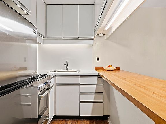 Apartment is pin drop quiet, and has hard wood flooring throughout, with a WALK-IN closet, new light fixture, kitchen has Stainless Steel refrigerator and stove, with lots of cabinet space for storage. Wonderful alcove layout allows you to tuck away your bed (can fit Queen or even King size bed) and plenty of room for living space.